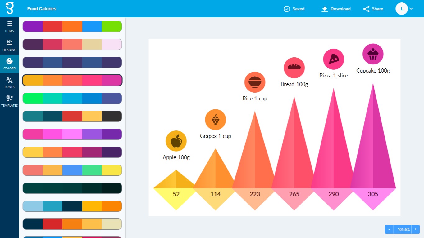 Tạo đồ họa thông tin và hình ảnh thông minh mạnh mẽ mà không cần bất kỳ kỹ năng thiết kế nào. Trừ khi bạn là một nhà thiết kế đồ họa sáng tạo, không dễ để tạo ra một đồ họa thông tin đẹp mắt cho bài thuyết trình, bài tập hoặc bài đăng trên blog. Graficto là một công cụ tạo đồ họa thông minh và dễ sử dụng, cho phép bạn tạo các thiết kế trong vài giây. Graficto có hàng trăm mẫu đồ họa thông tin được thiết kế chuyên nghiệp cho danh sách, quy trình, chu kỳ hoặc thậm chí là biểu đồ. Tất cả những gì bạn phải làm là chọn mẫu bạn thích và bắt đầu thêm nội dung. Hình ảnh của bạn sẽ tự động thay đổi khi bạn thêm, chỉnh sửa, xóa mục hoặc thay đổi văn bản và biểu tượng. Bạn chỉ cần tập trung vào nội dung, Graficto sẽ thiết kế. Nếu bạn không hài lòng với màu sắc và phông chữ mặc định, Graficto có rất nhiều bảng màu và phông chữ được lựa chọn cẩn thận để bạn lựa chọn. Chỉ cần một cú nhấp chuột để áp dụng một. Sau khi hoàn tất, bạn có thể nhanh chóng xuất thiết kế ở độ phân giải cao sang nhiều định dạng hình ảnh và vector khác nhau. Hoặc nó có thể được chia sẻ dễ dàng trên bất kỳ phương tiện truyền thông xã hội hoặc nền tảng nào có URL công khai. Làm cho ý tưởng và dữ liệu trở nên dễ hiểu với đồ họa thông tin hoàn hảo chỉ trong vài giây. Nhận quyền truy cập cao cấp trọn đời vào Graficto ngay hôm nay!