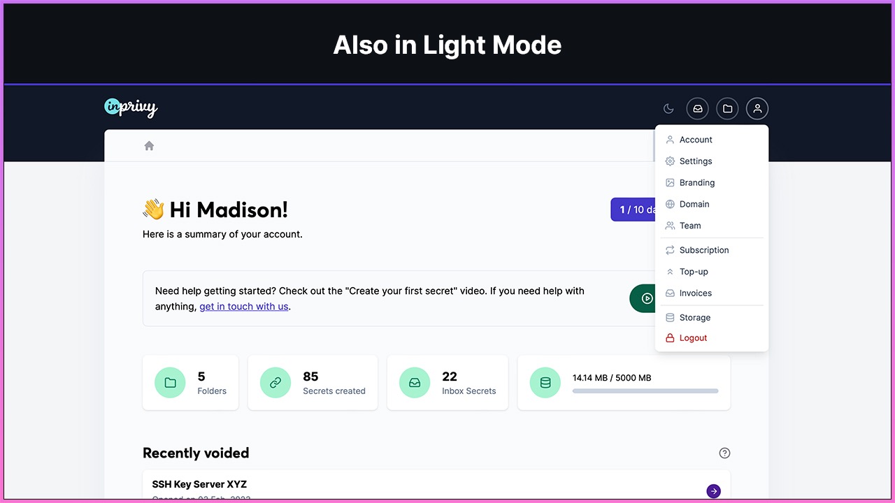Tạo một liên kết an toàn sẽ bị vô hiệu sau khi người nhận mở (có sẵn nhiều tùy chọn hơn). Đặt ngày hết hạn và theo dõi thời điểm bí mật chung của bạn được mở hoặc vô hiệu cũng như ai đã mở chúng. Phân loại các bí mật có thể chia sẻ trong các thư mục, chia sẻ tệp một cách an toàn, làm việc theo nhóm, v.v.