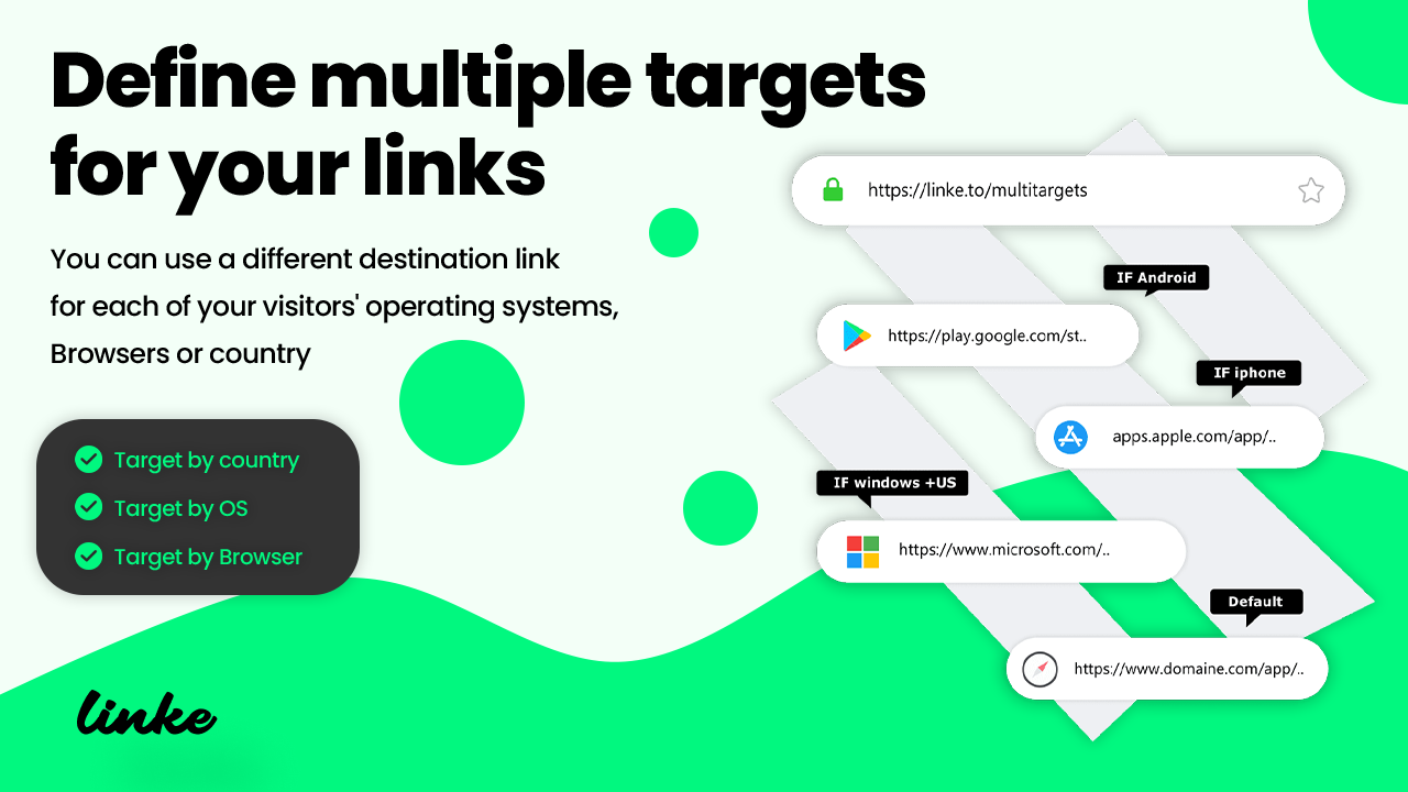 * Xác định nhiều chuyển hướng cho các liên kết và mục tiêu của bạn theo Hệ điều hành, Theo Trình duyệt và theo quốc gia hoặc sử dụng kết hợp phù hợp với nhu cầu của bạn.