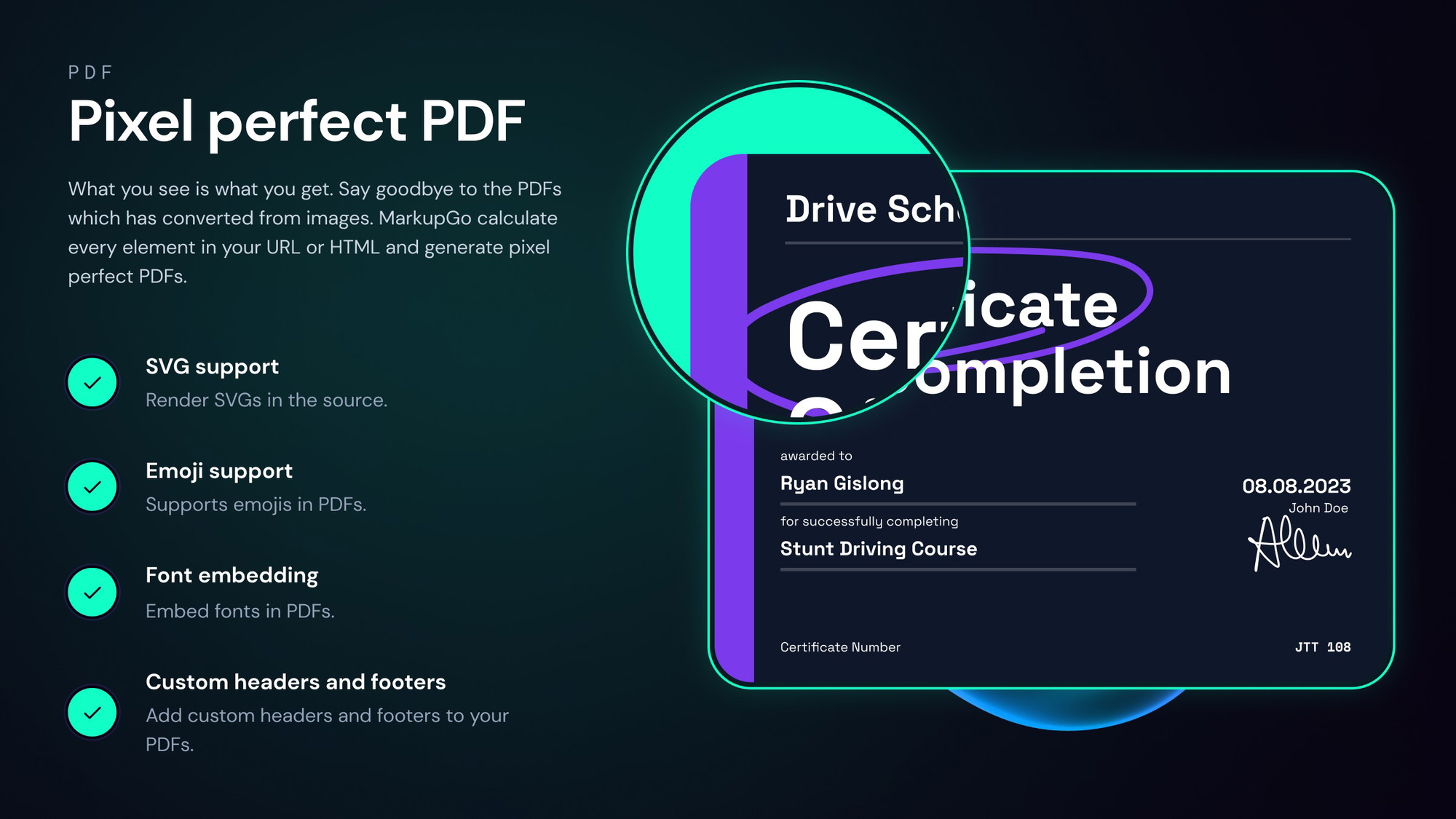 MarkupGo tạo các tệp PDF và hình ảnh chất lượng cao trực tiếp từ nội dung HTML của bạn, cho phép kiểm soát hoàn toàn hình thức và chức năng với sự hỗ trợ dành cho CSS và JavaScript.