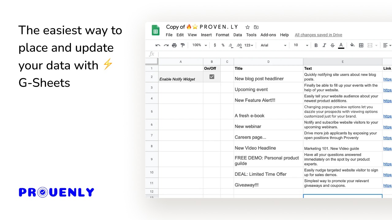 Việc quản lý và cập nhật dữ liệu thông báo thật dễ dàng nhờ Tính năng tích hợp Google Trang tính của Proven.ly, đảm bảo thông báo của bạn luôn cập nhật.