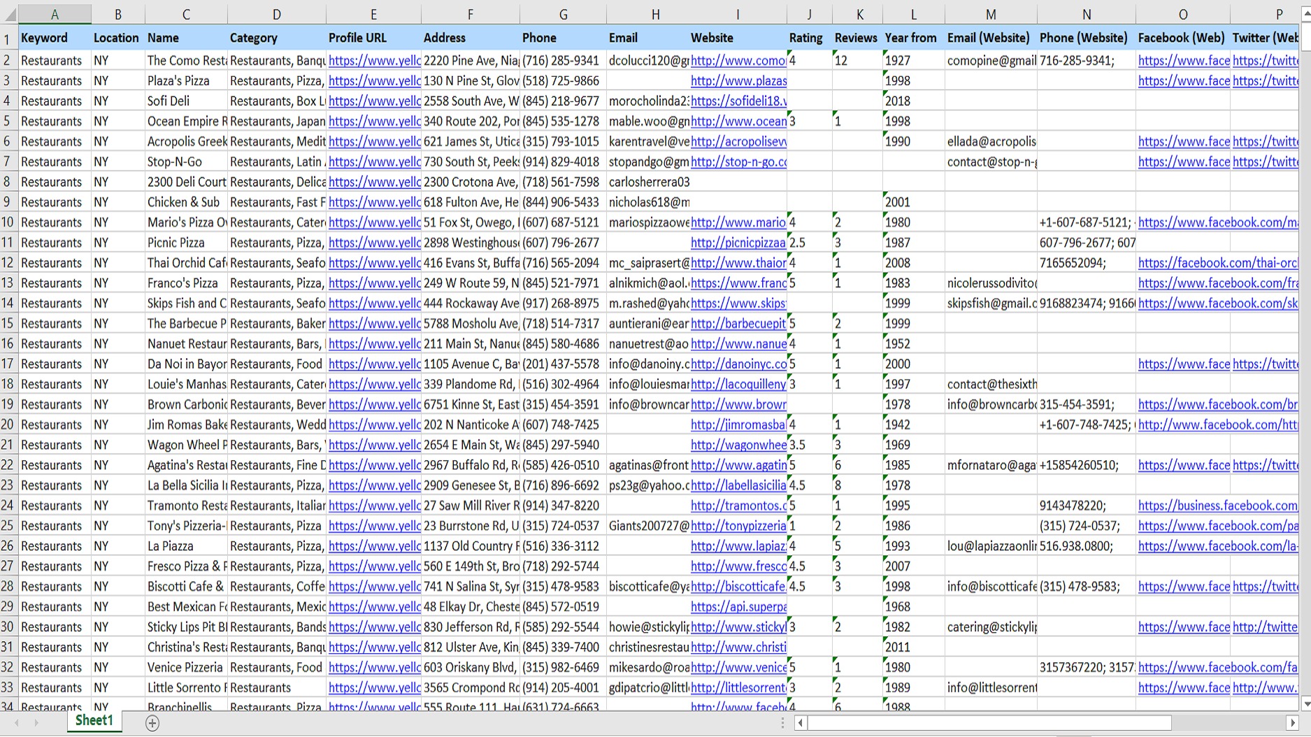 Quét dữ liệu bao gồm các trường sau:Vị trí tìm kiếm, thứ hạng tìm kiếm, hồ sơ/tên công ty, danh mục, URL hồ sơ, địa chỉ đầy đủ, số điện thoại, địa chỉ email, trang web, xếp hạng, không. Trong số các đánh giá, số năm kinh doanh, email từ trang web, số điện thoại từ trang web, hồ sơ mạng xã hội từ trang web, v.v.