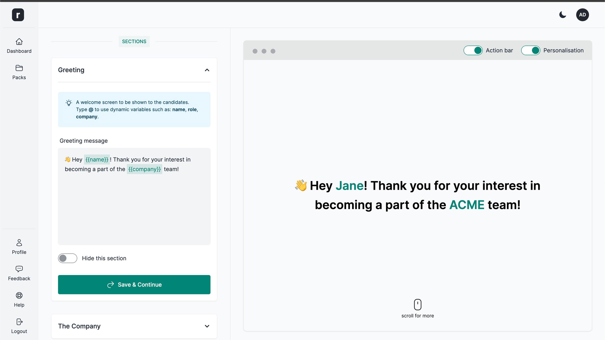 Tự động chèn tên của ứng viên và các thông tin khác vào gói ứng viên của bạn để có trải nghiệm cá nhân hóa hơn.