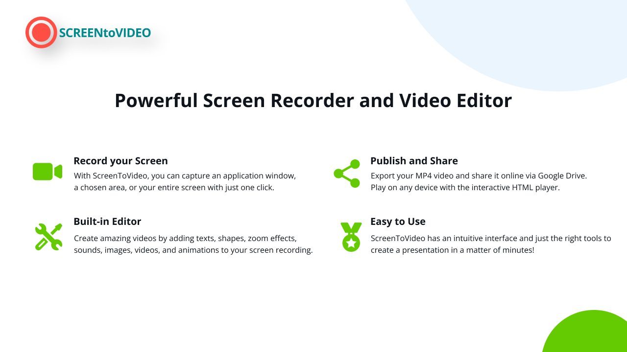 Ghi, chỉnh sửa và chia sẻ video của bạn bằng trình ghi màn hình và trình chỉnh sửa video mạnh mẽ nhưng dễ sử dụng với giao diện trực quan.