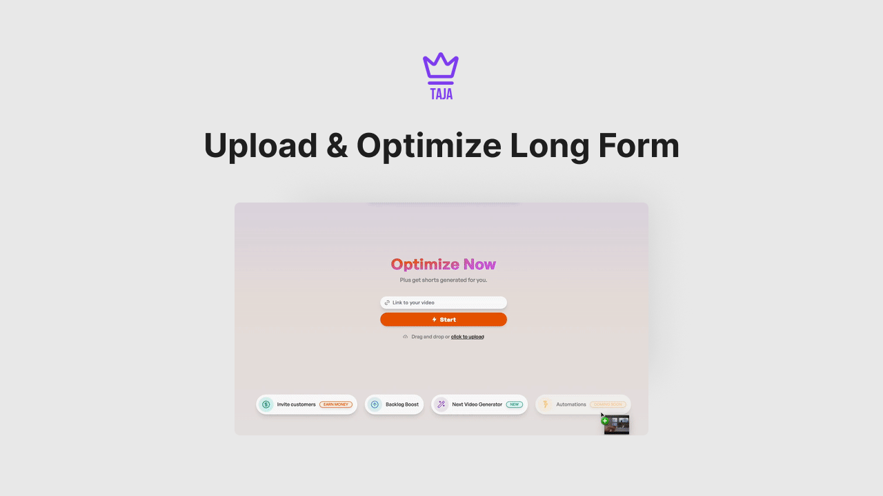 Việc biến nội dung dạng dài thành các bài đăng trên mạng xã hội cuộn cuộn có thể cảm thấy không thể—trừ khi bạn có Taja. Đơn giản hóa quy trình tạo video của bạn và tiếp cận nhiều nền tảng hơn với ít nỗ lực hơn.